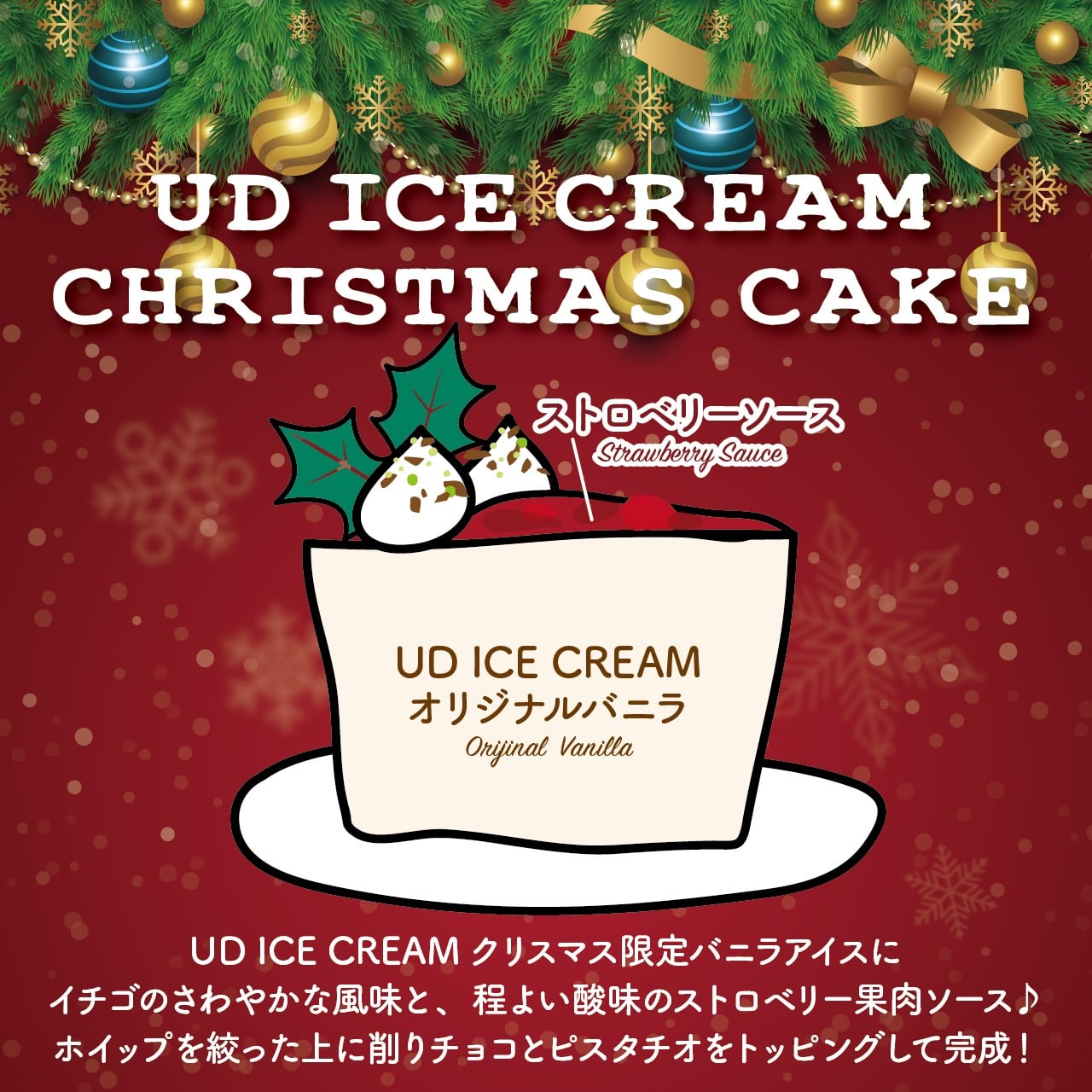 UD ICE CREAM クリスマス限定バニラアイスに、爽やかで程よい酸味のストロベリー果肉ソースとホイップをたっぷりのせました。